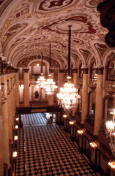 Left and Top Middle: This is the main stairwell that leads to the upper level balcony and gallery area. Paintings and statues decorated the next levels as people headed to their seats.